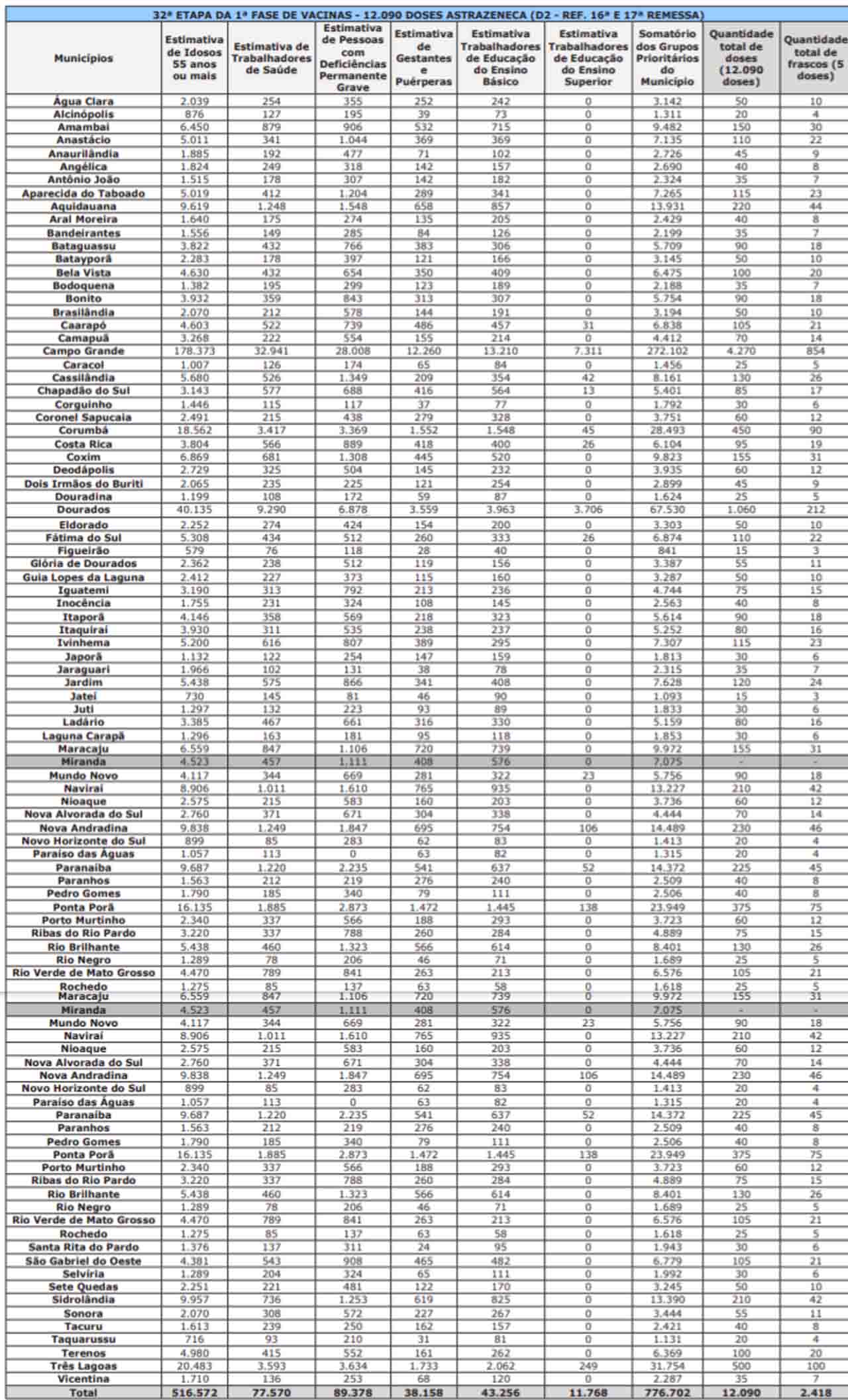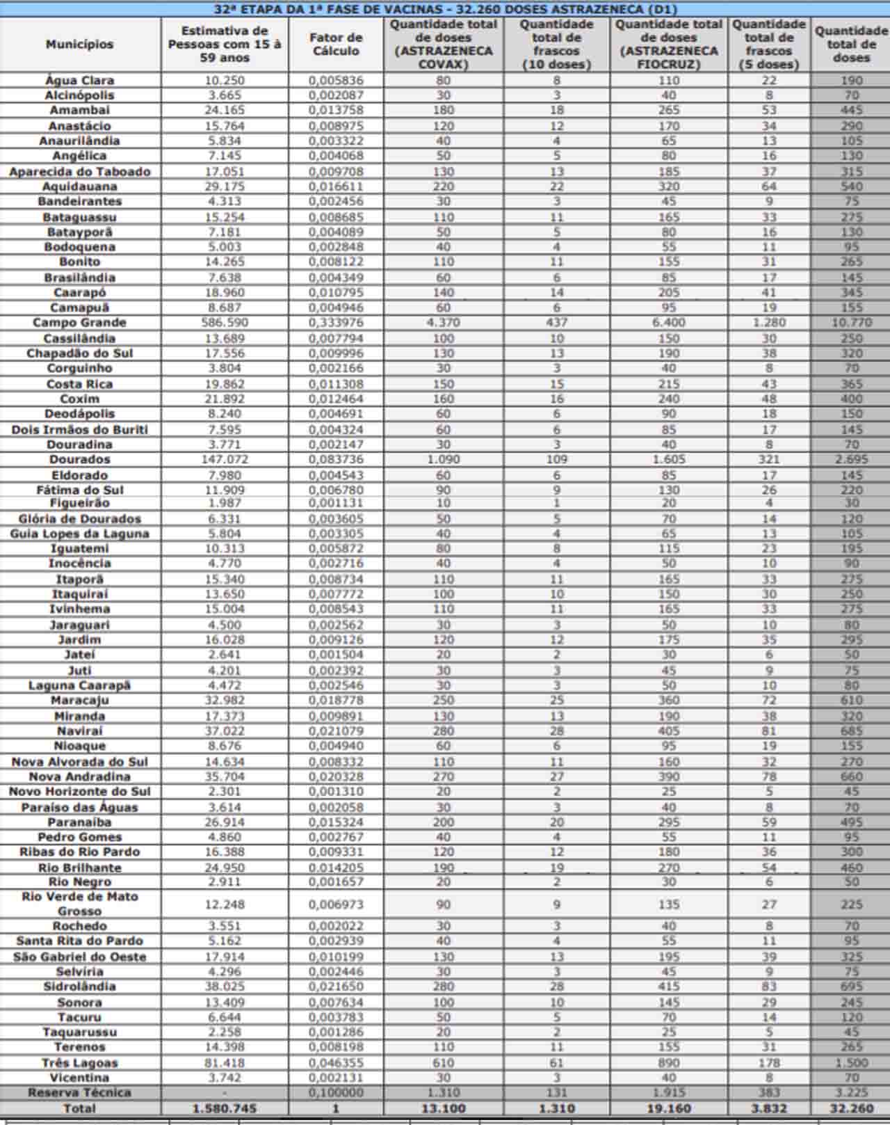 Outras 32.260 doses da AstraZeneca divididas conforme a tabela abaixo são para D1.