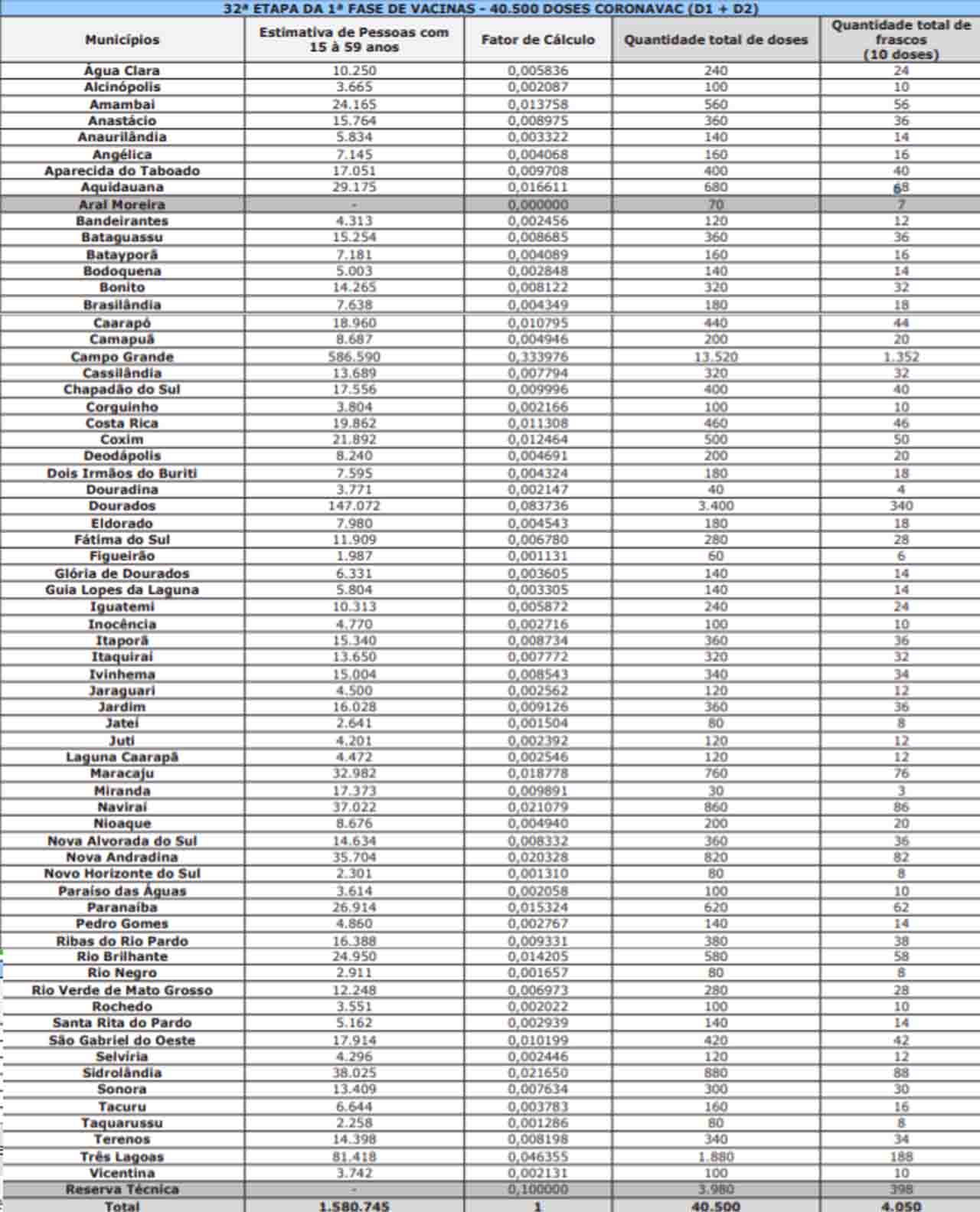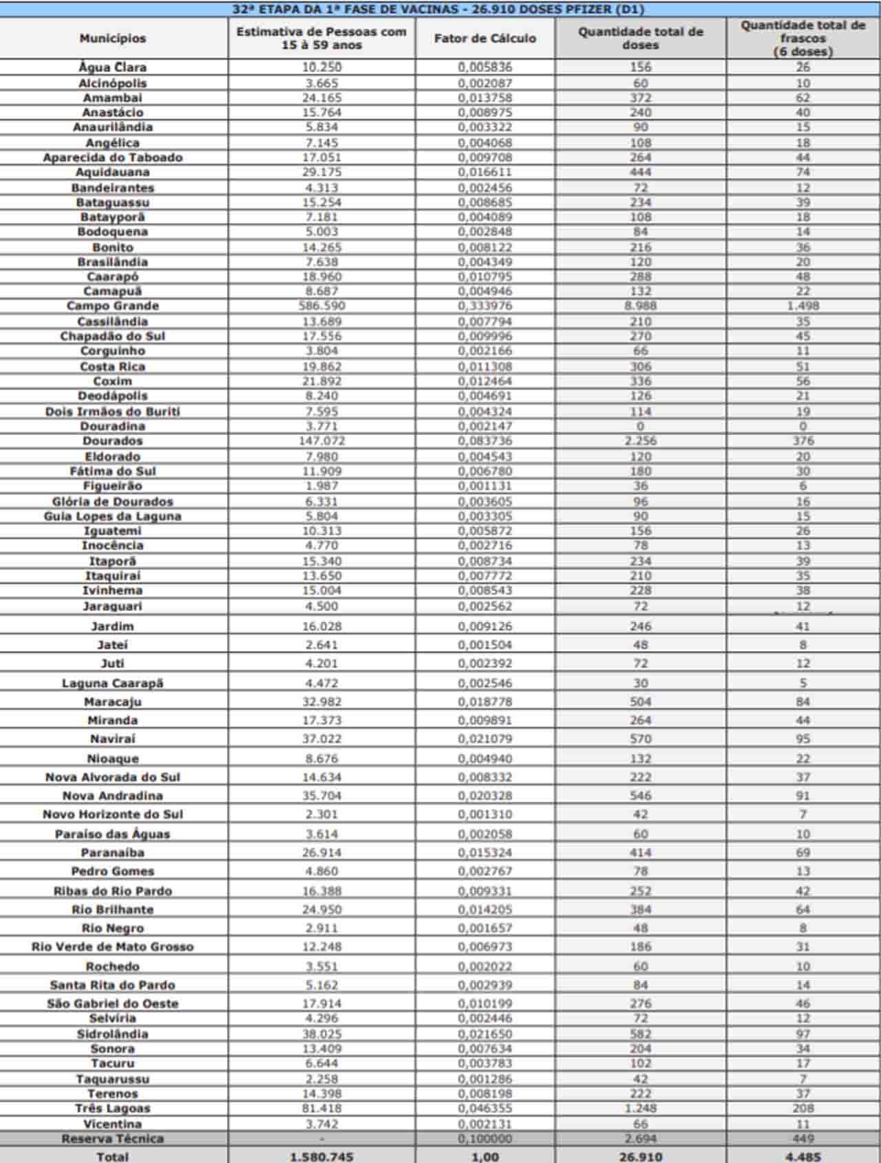 A SES-MS (Secretaria Estadual de Saúde) publicou, no Diário Oficial desta terça-feira (27), a lista com a quantidade que cada município de Mato Grosso do Sul vai receber das 112.660 doses de vacina contra covid que chegam entre esta terça e quarta-feira ao Estado.