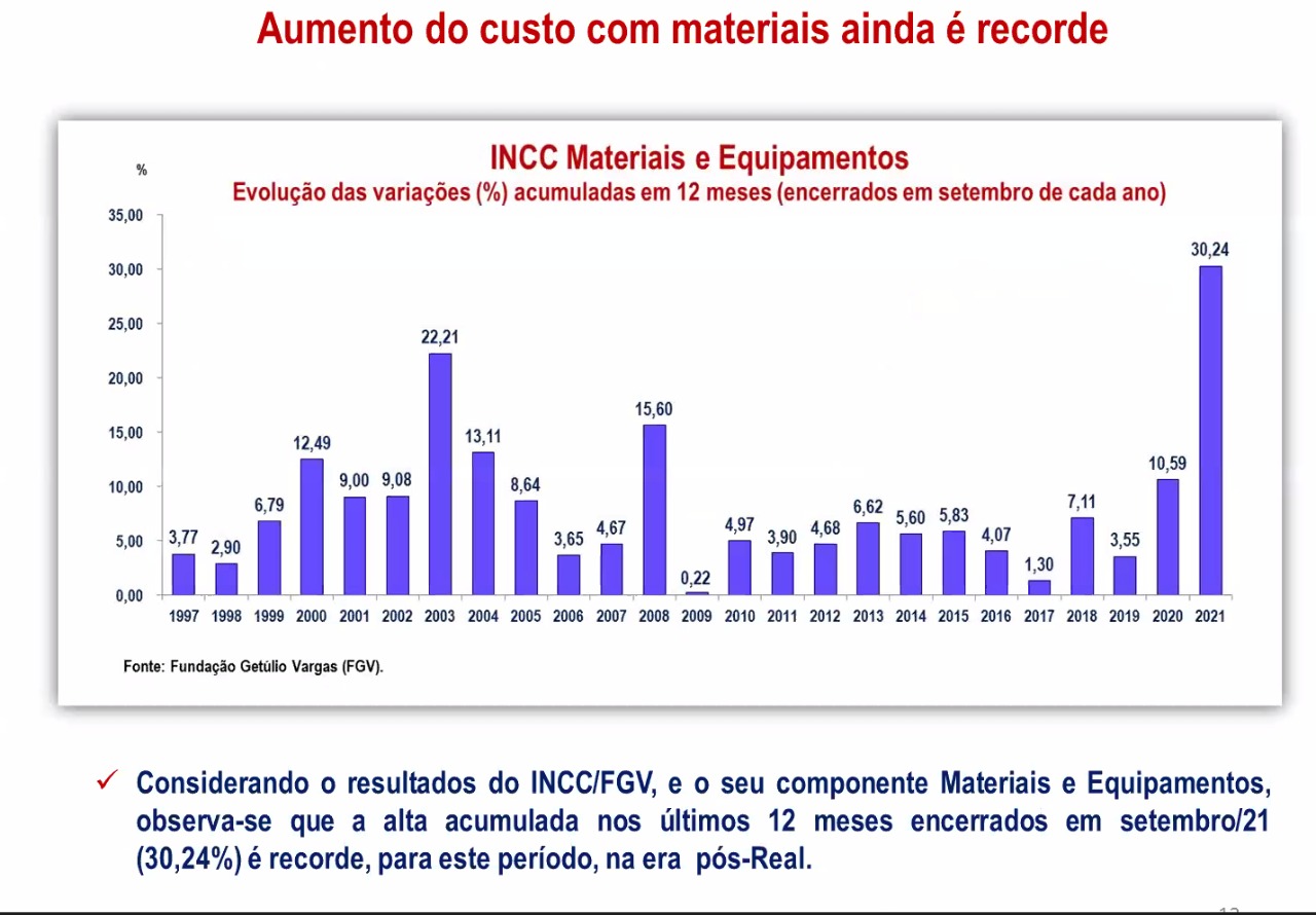 Além disso, o INCC (Índice Nacional de Custo de Construção) apresentou o mais alto resultado da história do plano real, com 30,24%. A taxa considera os últimos 12 meses, fechando sempre em setembro. Antes deste ano, o índice mais alto foi registrado em 2003 (22,21%). Confira a evolução: