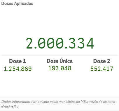 Conforme os dados apresentados no portal Mais Saúde, do Governo do Estado, foram aplicadas 2.000.334 doses em todo o MS, sendo 1.254.869 aplicações de primeiras doses; 552.417 aplicações de segundas doses e 139.048 pessoas que receberam a dose única.