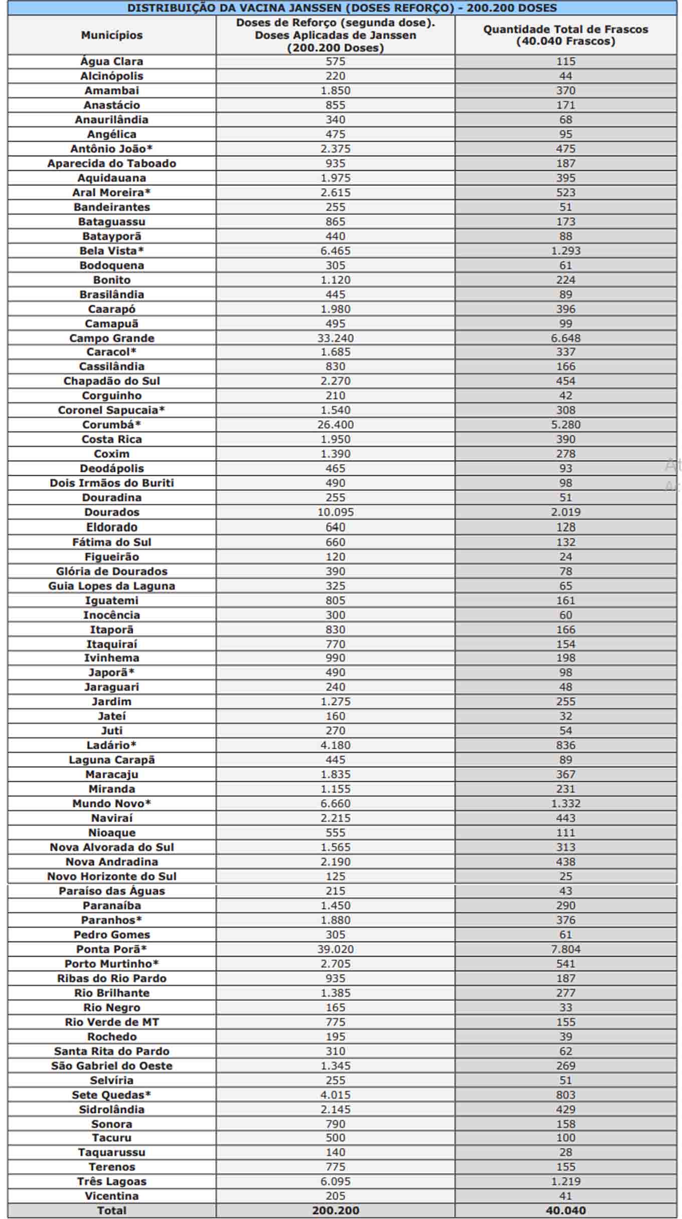 A SES-MS (Secretaria de Estado de Saúde de Mato Grosso do Sul) publicou, no Diário Oficial desta quinta-feira (9), a distribuição das 200.200 doses da vacina da Janssen contra a covid a municípios do Estado. Conforme a resolução, quase metade será destinada para reforço nas 13 cidades de fronteira, que vacinaram sua população com este imunizante para estudos da Fiocruz (Fundação Oswaldo Cruz).