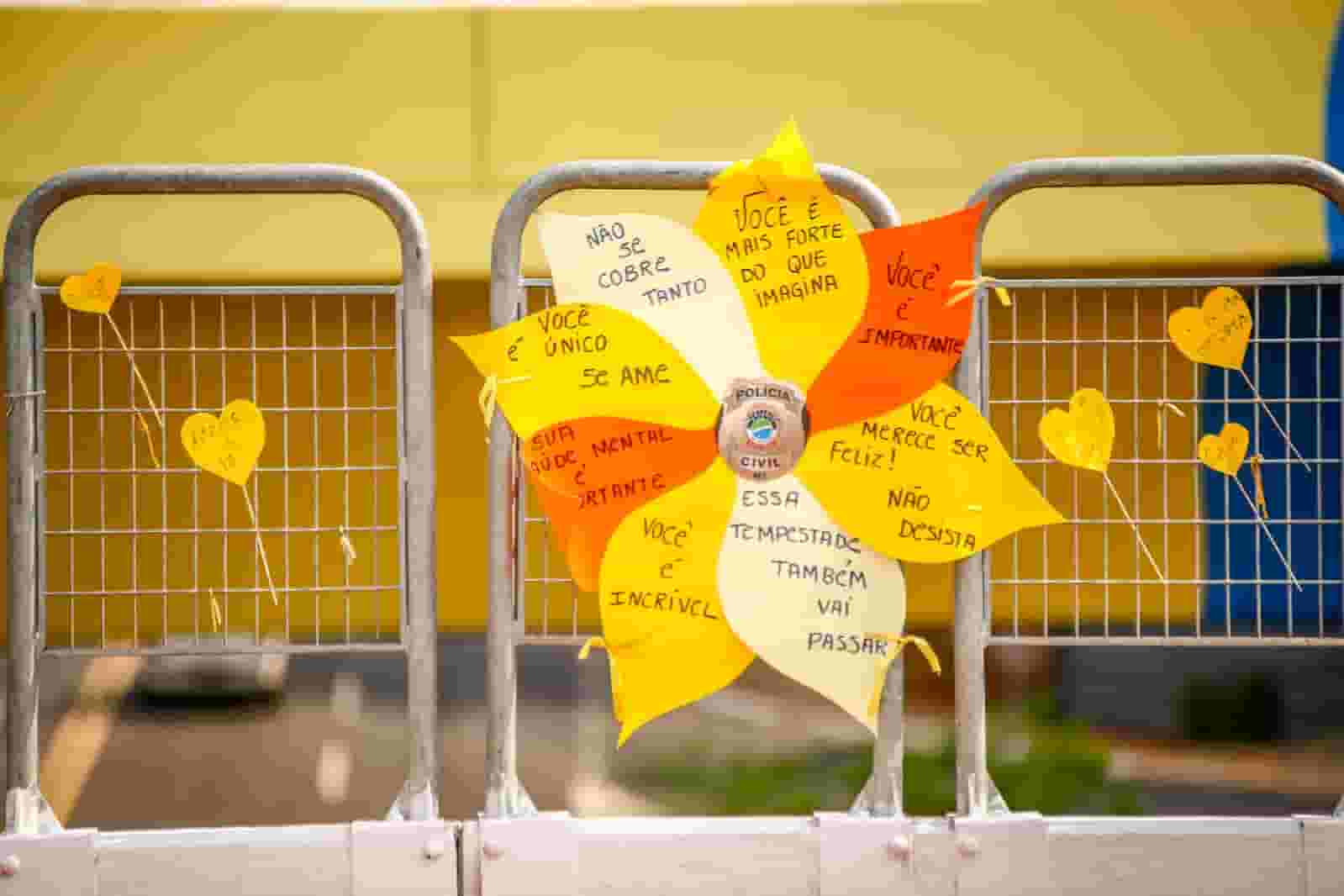 A DEAM (Delegacia Especializada de Atendimento à Mulher) realizou, nesta sexta-feira (24), ação integrante da Campanha Setembro Amarelo de prevenção ao suicídio, no viaduto Senador Italívio Coelho, localizado na Avenida Afonso Pena com Avenida Ceará. Balões, cartazes e fitas com mensagens de positividade foram colocadas no viaduto, que é conhecido por ser local de constantes tentativas e suicídios consumados.
