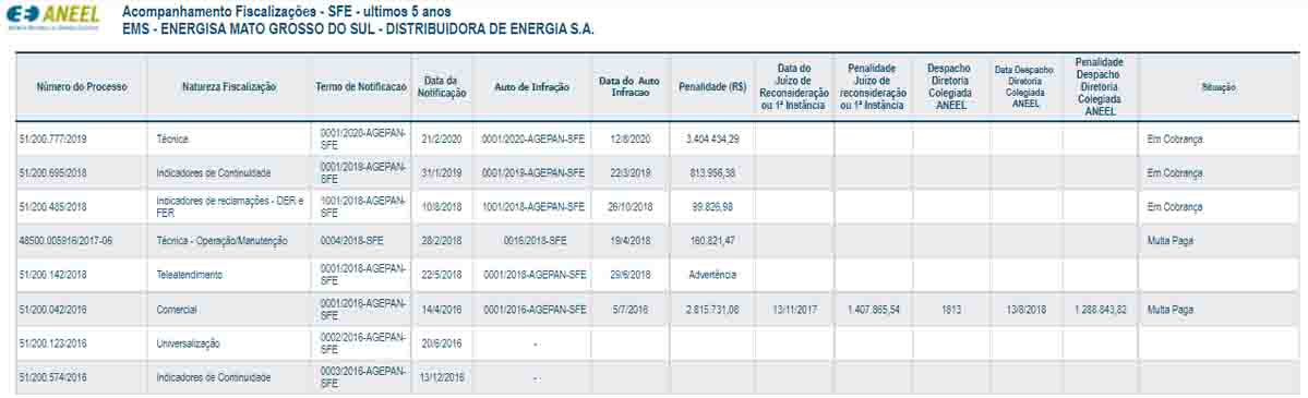 Campeã de reclamações no Procon, a Energisa coleciona série de penalidades aplicadas pela Aneel nos últimos anos. A mais recente ocorreu no ano passado, quando a Agepan (Agência Estadual de Regulação de Serviços Públicos de MS) determinou multa de R$ 3,4 milhões por descumprimento, por parte da concessionária, dos níveis de qualidade do fornecimento de energia. No fim do ano, a Energisa conseguiu redução da penalidade para R$ 1,7 milhão.