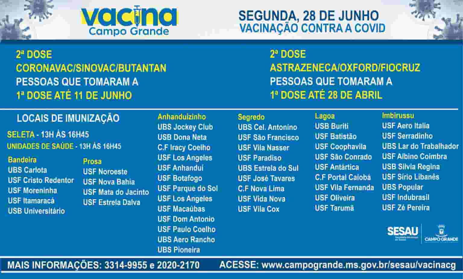 Após suspender a vacinação contra covid no domingo (27), Campo Grande retoma nesta segunda-feira (28) com aplicação somente da 2ª dose. Completam o ciclo vacinal pessoas que tomaram CoronaVac até o dia 11 de junho e quem tomou AstraZeneca até o dia 28 de abril.