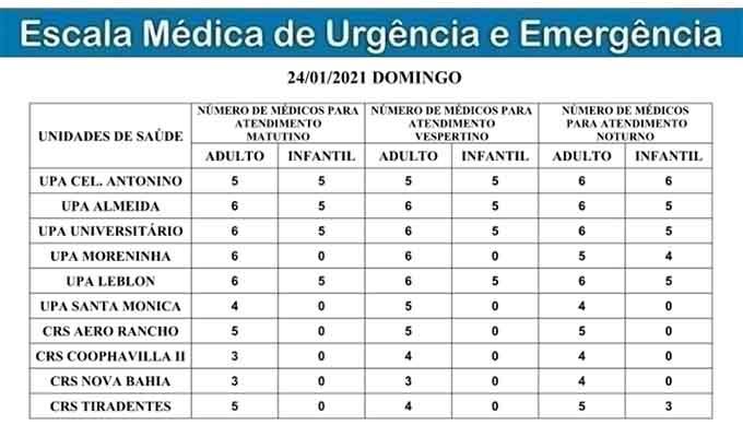 Confira abaixo a escala completa das UPAs e CRSs de Campo Grande para este domingo: