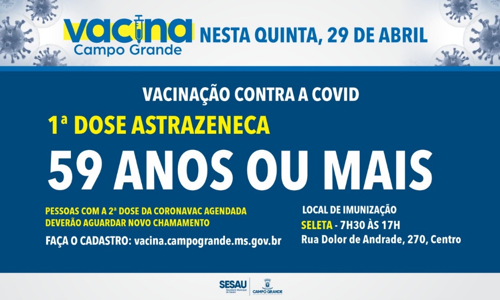 Campo Grande segue nesta quinta-feira (29) com a vacinação de pessoas com 59 anos ou mais. Assim, a imunização deste público pode ser feita das 7h30 às 17h na Seleta, localizada na Rua Dolor de Andrade, 270.