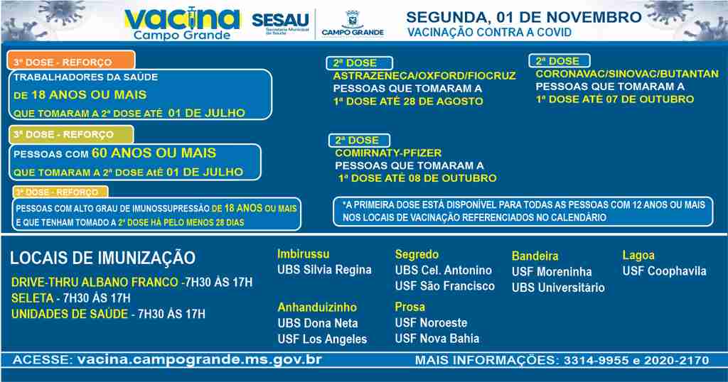 A campanha de imunização começará às 7h30 e seguirá até às 17h nas unidades de saúde de Campo Grande, assim como no drive-thru Albano Franco e na Seleta. Confira abaixo: