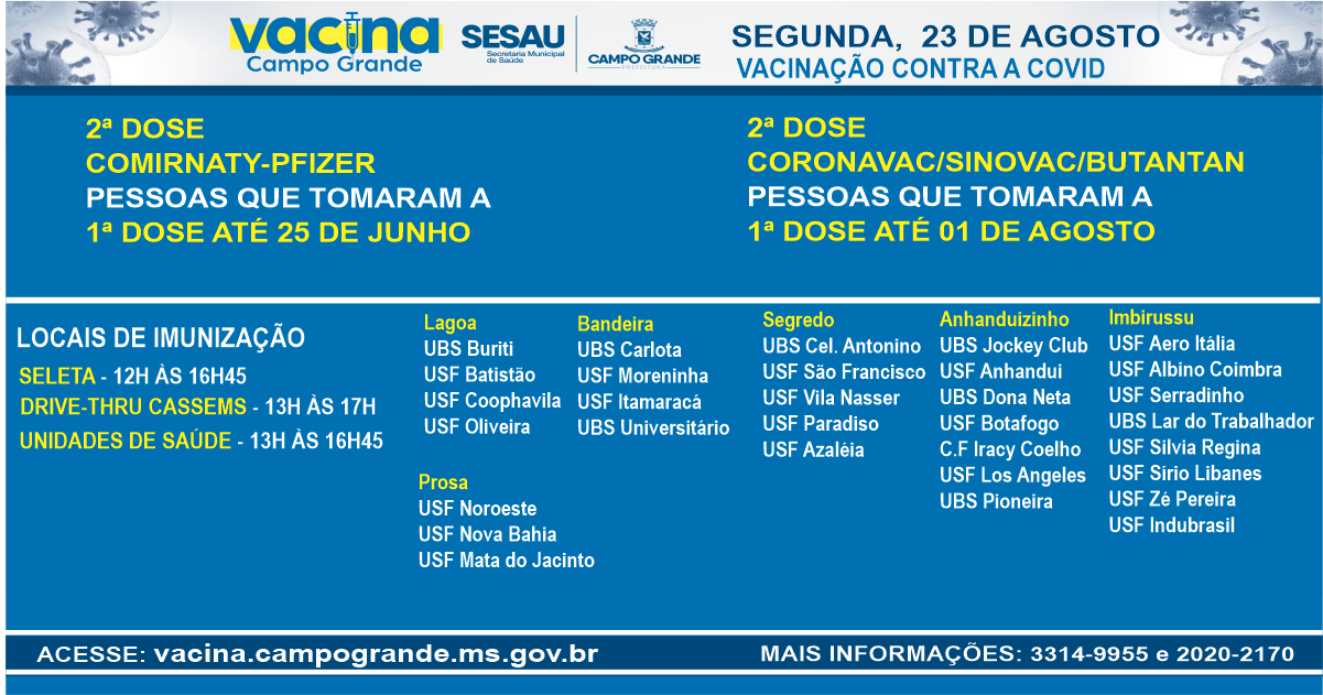 A vacinação acontece somente na Seleta, no drive-thru da Cassems e nas unidades de saúde no período da tarde. É importante já estar cadastrado no site antes de ir até o polo de imunização. Mais informações podem ser obtidas pelos telefones 3314-9955 e 2020-2170.