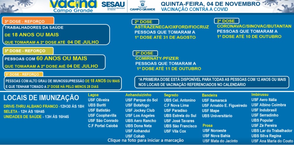 A campanha de imunização começará às 7h30 e seguirá até às 17h nas unidades de saúde de Campo Grande, assim como no drive-thru Albano Franco e na Seleta. Confira abaixo: