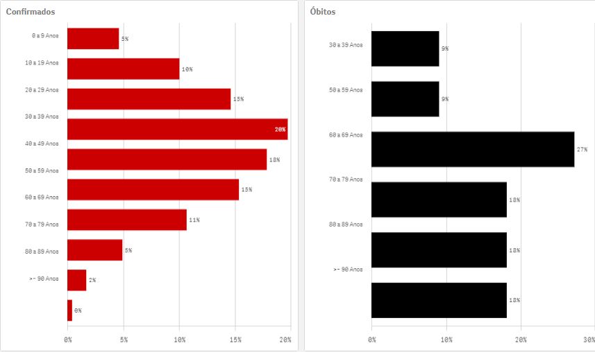 Na sequência, com 18%, estão aqueles que têm idade entre 40 a 49 anos. Jovens de 20 a 29 anos representam 11% dos infectados, seguidos pela faixa etária de 10 a 19 anos com 11%, assim como idosos com 60 a 69 anos que também representam 11% dos positivados.