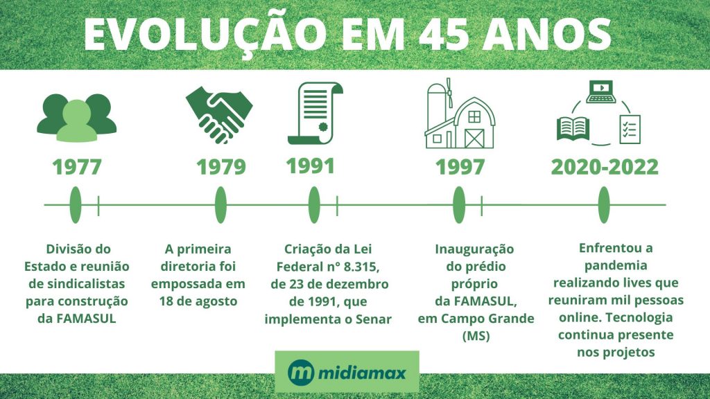 Fazendo um retrospecto, antes destes cursos estarem disponíveis para população, a Famasul foi evoluindo aos poucos, acompanhando o crescimento do Estado. “Houve a divisão em 1977 e existiam já alguns sindicatos mais antigos, em cidades pujantes como Campo Grande, Rio Verde e Corumbá por exemplo. A Federação então surgiu e passou a congregar estes sindicatos, evoluindo juntamente com eles, em uma evolução parecida com a do nosso Estado. Um estado novo, com algumas cidades em destaque, porém, ainda pouco povoado e com pouca expressão de produção, mais focado na pecuária de corte”, explicou ao Midiamax o gerente técnico do Sistema Famasul, José Carlos de Pádua Neto.