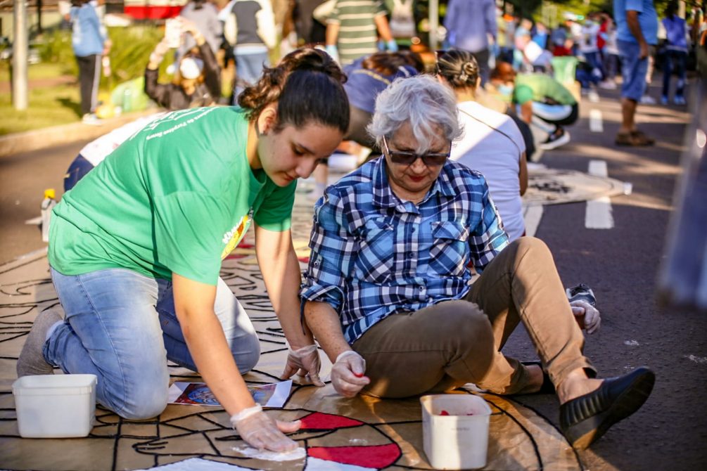 Após dois anos suspensa por conta da pandemia, a montagem do tapete de Corpus Christi voltou ser feito em Campo Grande e com público ‘renovado’. Isso porque muitas crianças que ainda não haviam participado da confecção da tradição católica, se juntaram aos adultos na missão de colorir as ruas do Centro.