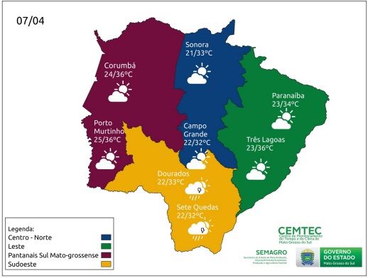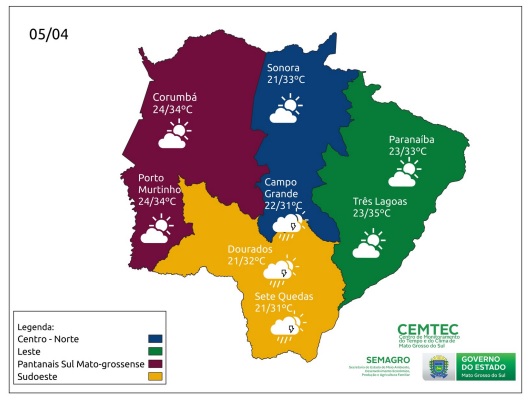 No restante do MS o tempo será firme, com sol e variação de nebulosidade devido a atuação da circulação anticiclônica, que favorece o tempo quente e seco. São esperadas temperaturas entre 21°C a 30°C na região sudoeste, 24°C a 34C na região pantaneira, até 35°C na região leste, até 32°C na região norte e na Capita.