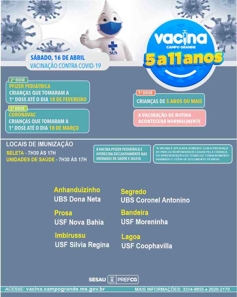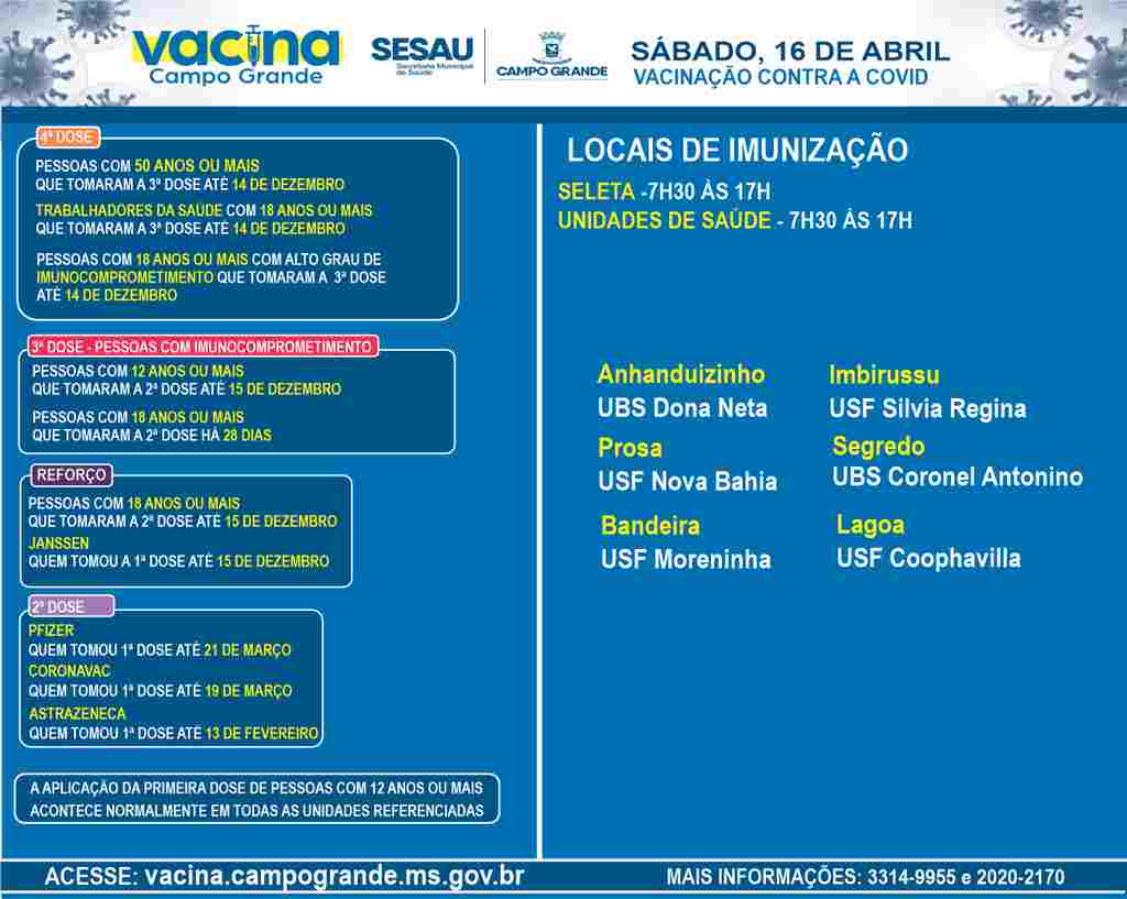 A Sesau (Secretaria Municipal de Saúde) segue com o calendário de vacinação contra Covid-19 neste sábado (16) em Campo Grande. A aplicação das vacinas irá ocorrer na Seleta e nas unidades de saúde.