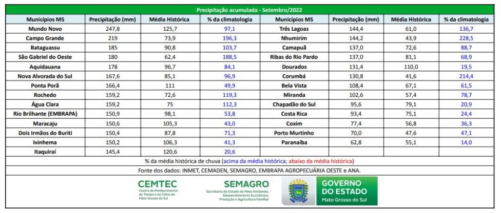 O mês passado foi generoso no volume de chuvas em Mato Grosso do Sul com precipitação acumulada acima da média histórica em todo Estado, conforme apontam os dados do boletim de Monitoramento de Secas de Setembro 2022, elaborado pelo Cemtec (Centro de Monitoramento do Tempo e do Clima de Mato Grosso do Sul).