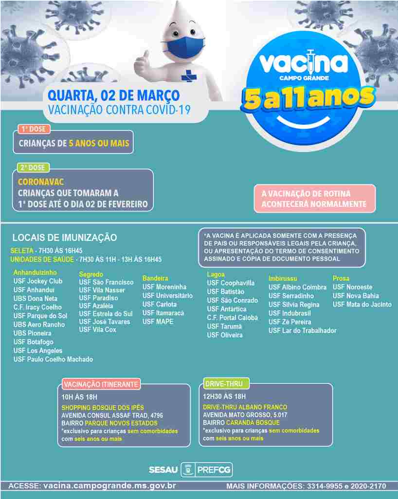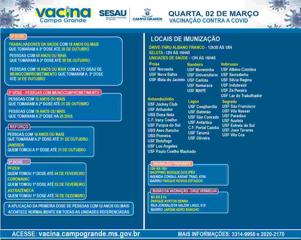 A Sesau (Secretaria Municipal de Saúde) segue com o calendário de vacinação contra Covid-19 nesta quarta-feira (2) em Campo Grande. A aplicação das vacinas irá ocorrer na Seleta, unidades de saúde e também no drive-thru Albano Franco.