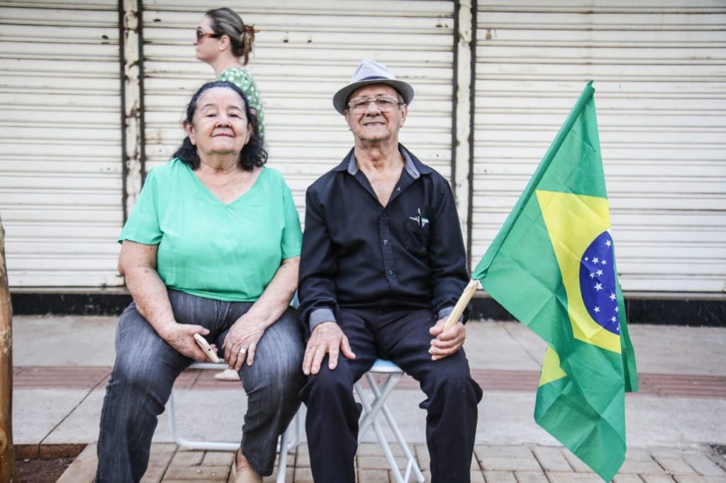 Juntos há 57 anos, o casal Adaltu Valente de Oliveira, de 81 anos, e Eli Paiva de Oliveira, de 78 anos, acompanha há três décadas o desfile da Independência. Sentados de mãos dadas nas cadeiras que trouxeram de casa, aguardavam com uma bandeira do Brasil o início do evento, que é uma tradição no calendário anual dos dois.
