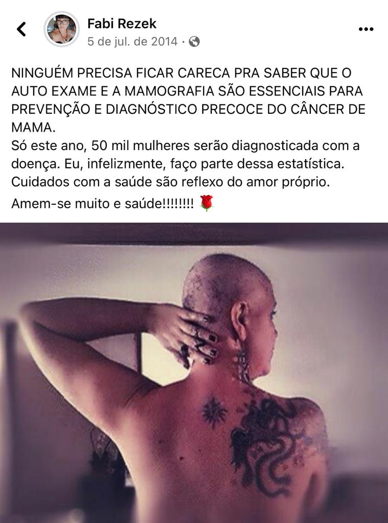 A história de Fabianne Rezek com o câncer inicia com os ancestrais que tiveram a doença. O câncer venceu muitos parentes da família, inclusive o pai da publicitária. A predisposição genética facilita que o tumor se manifeste. Na vida da mulher, atualmente com 47 anos, o diagnóstico de câncer de mama chegou em 2014 após quatro meses tomando antibióticos para combater uma suposta inflamação.