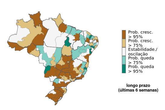 Na lista de unidades federativas e capitais, Mato Grosso do Sul e Campo Grande aparecem com tendência de crescimento de contaminados pela doença a longo prazo. Das 27 UF, 20 estão com potencial de crescimento. E das capitais, 19 apresentam crescimento.