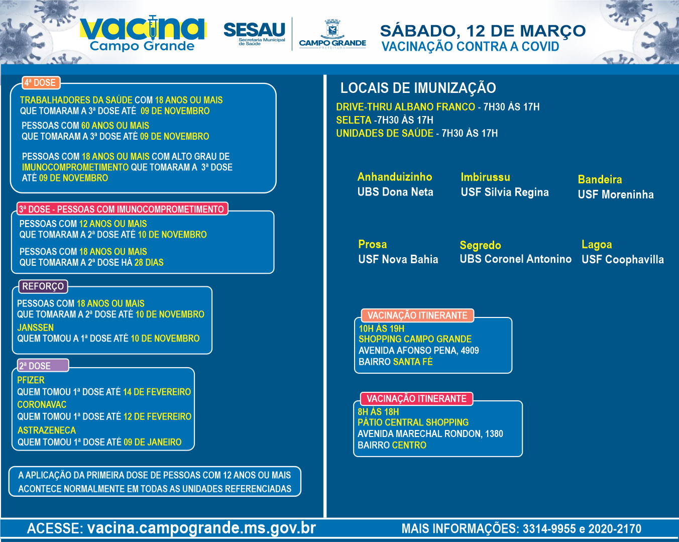 O calendário de vacinação contra Covid-19 em Campo Grande contempla, neste sábado (12), a aplicação da 4ª dose para os trabalhadores da saúde acima dos 18 anos que tomaram a 3ª dose até 09 de novembro. Idosos acima dos 60 anos sem doenças imunossupressoras também podem tomar 4ª dose, desde que tenham tomado a 3ª dose até 09 de novembro de 2021.