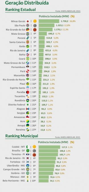 Levantamento da ABSolar (Associação Brasileira de Energia Solar Fotovoltaica) deste mês de maio revela que Mato Grosso do Sul ocupa a 11ª posição no ranking nacional de geração distribuída de energia solar.