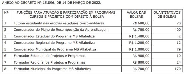 Decreto publicado nesta terça-feira (15) regulamenta o pagamento de Bolsa de até R$ 1,4 mil, aos servidores públicos designados para atuação e participação em eventos nos Programas MS Alfabetiza, Recomposição da Aprendizagem, Escolas Estaduais Cívico-Militares, e demais cursos, programas e projetos relacionados ao desenvolvimento e à manutenção da educação básica, desenvolvidos pela SED-MS (Secretaria de Estado de Educação de Mato Grosso do Sul).