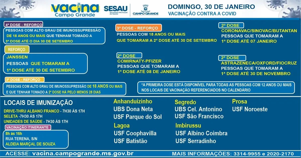 A dose de reforço da vacinação contra covid-19 neste domingo (30) em Campo Grande será para pessoas de todos os públicos com 18 anos ou mais que tomaram a segunda dose até o último dia 30 de setembro. Ao todo, são 12 os locais de vacinação.