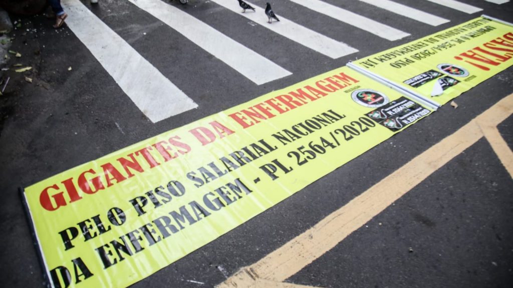Nas faixas expostas, a categoria não descarta, inclusive, uma paralisação. “Se o piso não aprovar, a enfermagem vai parar”, diz um cartaz.