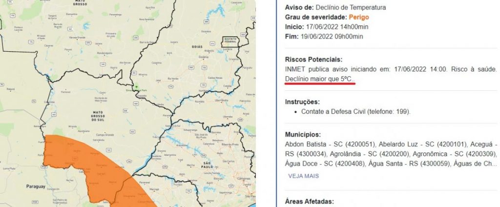Conforme o Inmet (Instituto Nacional de Meteorologia), o alerta com potencial perigo de declínio de temperatura é válido até este domingo (19). Confira a lista: