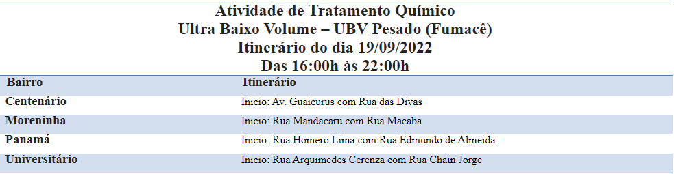 O serviço de borrifação UBV (ultra baixo volume), popularmente conhecido como fumacê, irá circular por 4 bairros de Campo Grande nesta segunda-feira (19). A ação tem o objetivo de combater o mosquito Aedes aegypti, transmissor de arboviroses como Dengue, Zika e Chykungunia. As equipes estarão nos bairros Jardim Centenário, Moreninha, Jardim Panamá e Universitário.