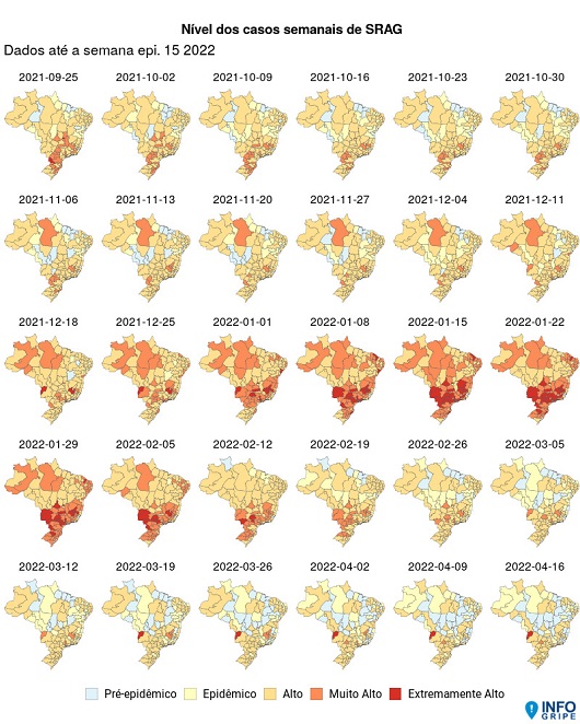 No total, 30 macrorregiões de saúde encontram-se em nível pré-epidêmico, 21 em nível epidêmico, 64 em nível alto, duas em nível muito alto e uma macrorregião de saúde em nível extremamente alto (Corumbá).