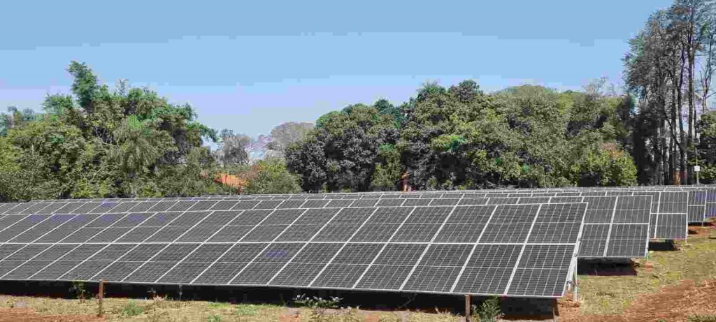 A paisagem verde do terreno, de repente contrasta com uma estrutura metálica, com dezenas de placas de energia solar instalada nas proximidades de uma das cercas. A energia consumida na área vem desse sistema, que também ajuda a abastecer mais duas empresas ligadas ao grupo que o ambientalista trabalha.