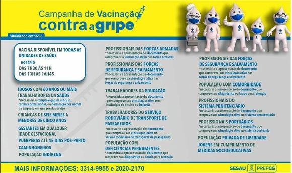Em Campo Grande, a adesão é considerada baixa. Apenas 27,73% dos grupos prioritários alvos da campanha se vacinaram contra gripe. A vacina contra a gripe está disponível em todas as unidades de saúde das 7h30 às 11h e das 13h às 16h45 todos os dias.