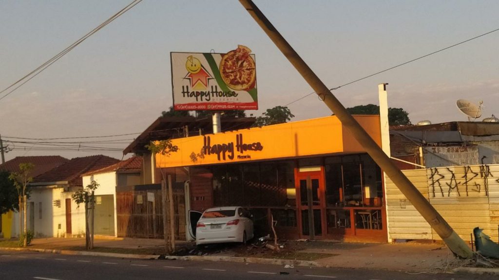 Motorista de um HB20 fugiu após invadir calçada da Rua José Antônio, bater em um poste de energia e só parar depois de atingir a entrada de uma pizzaria. O acidente aconteceu na manhã deste domingo (28) e, segundo testemunhas que passavam próximo, o suspeito tinha sinais de embriaguez e recolheu latas de cerveja antes de abandonar o local.