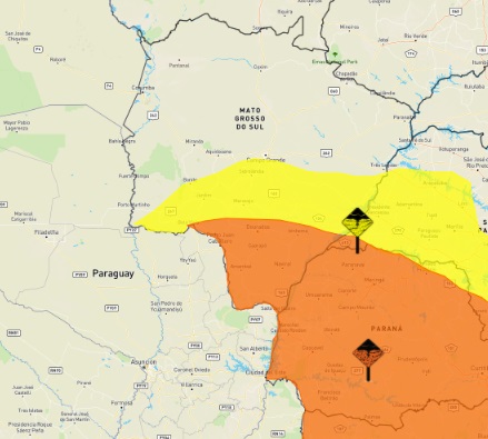 O primeiro aviso, de nível amarelo, prevê chuvas entre 20 e 30 mm/h ou até 50 mm/dia, ventos intensos de 40 a 60 km/h. Baixo risco de corte de energia elétrica, queda de galhos de árvores, alagamentos e de descargas elétricas durante o temporal.