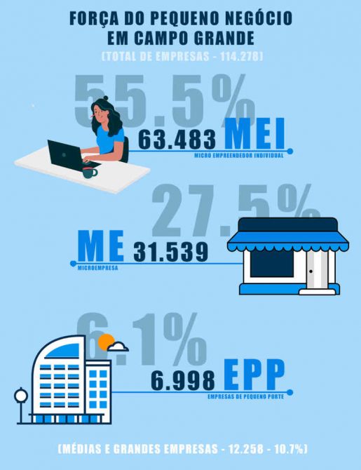 Do total de 114.278 empresas registradas na Capital de Mato Grosso do Sul, 63.483 são MEIs, equivalente a 55.5%; 31.539 são MEs, ou seja, 27.5% das empresas; 6.998 são EPPs, uma fatia de 6.1% e as médias e grandes empresas são 12.258 do total, que representa 10.7%.