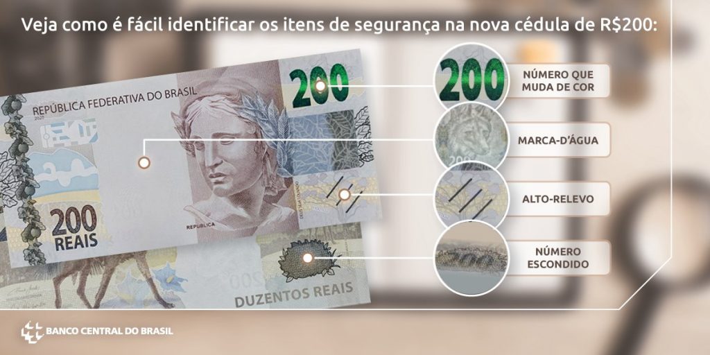 No caso do lançamento mais recente, a nota de R$ 200, os itens de segurança contam com número 200 que muda de cor, marca d’água, alto relevo e até número escondido. Confira abaixo.