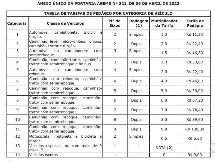 Confira a seguir, a tabela e veja como ficam os valores dos pedágios cobrados na rodovia: