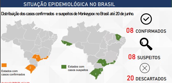 O caso notificado em Mato Grosso do Sul, de um adolescente boliviano internado na Santa Casa de Corumbá, foi descartado em 10 de junho. De acordo com nota da secretaria de Saúde de Corumbá, o resultado do exame do adolescente foi negativo para Monkeypox.