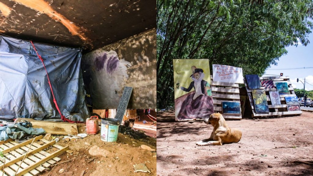 “Daqui é para melhorar. Esse é o nosso sentimento de lar. Aqui a gente passa perrengues, o vento leva tudo às vezes, já perdi muito material de trabalho, tento buscar o melhor, por isso eu me dedico mais às artes. O meu sonho é uma casa com tijolo, porta e, principalmente, segurança. Esses tempos teve acidente em que o carro invadiu aqui, esse é o nosso medo”, relata o homem.
