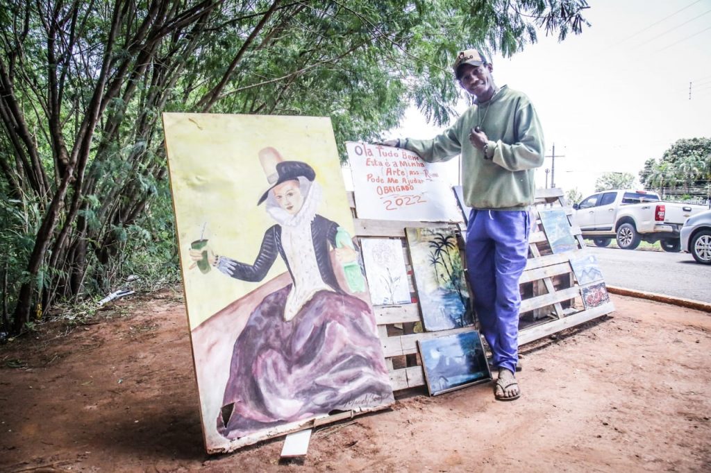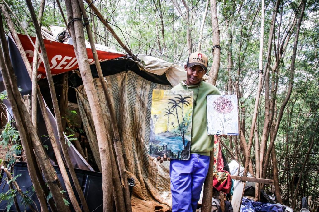 Ronerverson dos Santos, de 32 anos, construiu o barraco no ângulo de 45 graus, desafiando as leis da natureza em um solo castigado pela correnteza da água em dias de chuva. As mãos são finas e calejadas, levemente sujas pelos materiais de pintura. Na calçada da via movimentada, comercializa as telas feitas com pedaços de azulejo e madeira, tudo que encontra na reciclagem ou recebe por meio de doações.