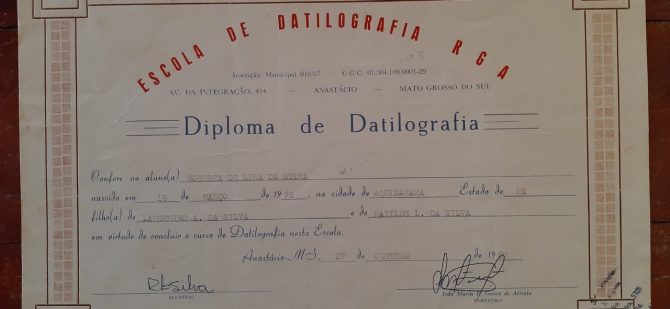 O diploma do curso de datilografia feito ano de 1987 era uma necessidade na época e exigência para desempenho na função, relembra ela ao Jornal Midiamax. “Era um diferencial ao ingresso o mercado de trabalho, sobretudo para trabalhar em escritórios, bancos, entre outros, na época”, conta.