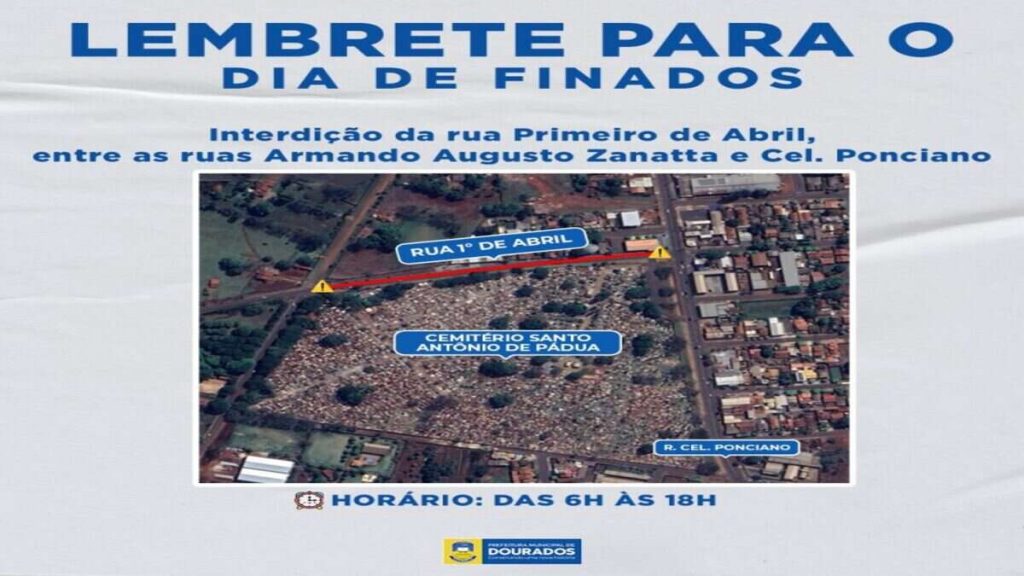 O trânsito nas proximidades do Cemitério Santo Antônio de Pádua será interditado na próxima quarta-feira (2) de novembro, Dia de Finados, em Dourados. O tráfego de veículos será impedido na rua Primeiro de Abril, via lateral à unidade, também conhecida como Palmeiras por ter esse nome em outro segmento. O trecho fechado será entre as ruas Coronel Ponciano e Armando Augusto Zanatta, das 6h às 18h.
