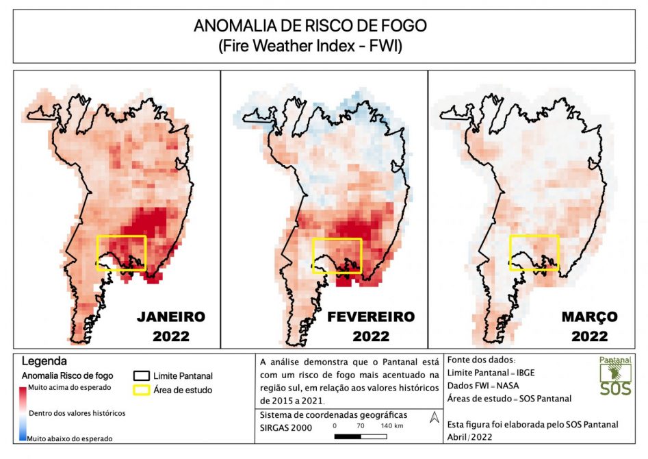 Em janeiro, fevereiro e março, conforme o levantamento da instituição, o bioma teve riscos altos para as queimadas. “Nossa análise indica que, principalmente no Pantanal do Mato Grosso do Sul, nas regiões de Miranda e Aquidauana, o risco de incêndios florestais este ano está muito elevado. As condições propícias e o acúmulo de biomassa (matéria orgânica) potencializam as chances de eventos de fogo mais extremos”.