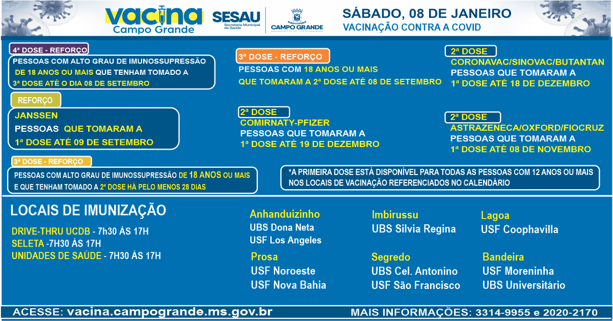 A Sesau (Secretaria Municipal de Saúde) disponibiliza vários pontos de vacinação neste sábado (8), em Campo Grande. Hoje, a população pode se imunizar em unidades de saúde e no Drive-thru UCDB (Universidade Católica Dom Bosco).