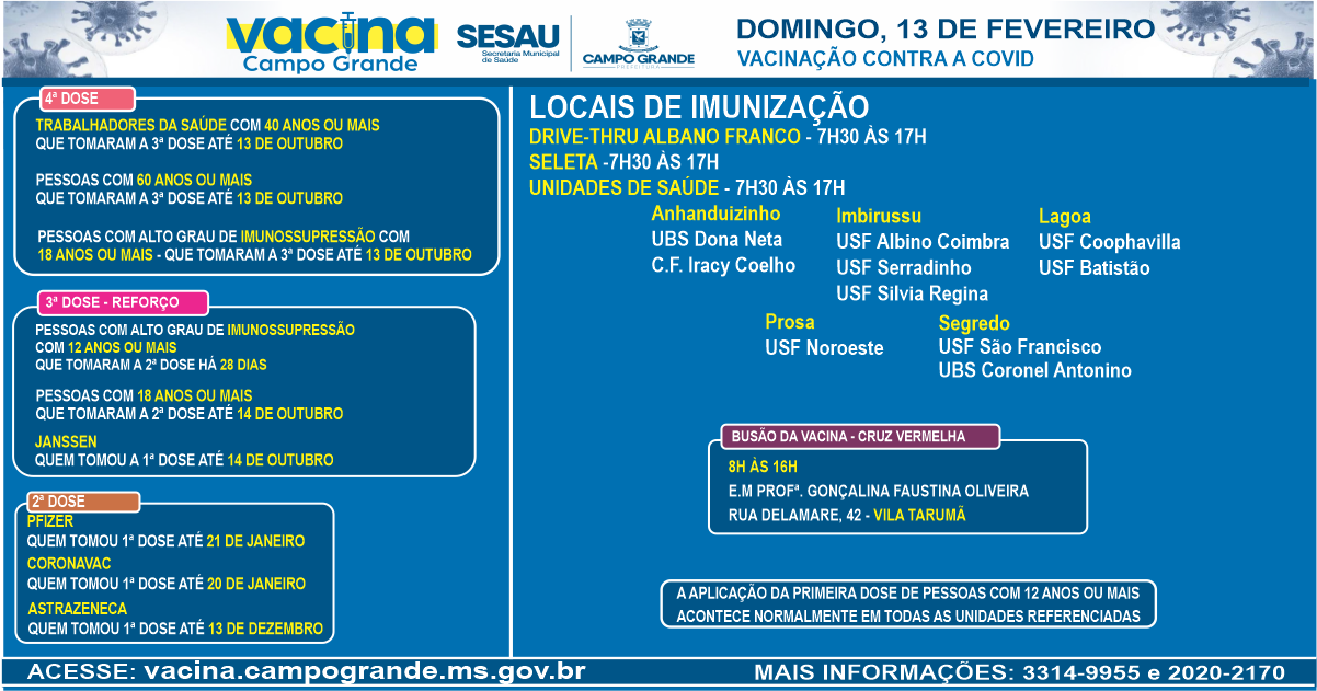 Crianças, adolescentes, adultos e idosos, podem se vacinar contra a Covid-19 até às 17h deste domingo (13), em Campo Grande. Unidades de saúde, drive-thru Albano Franco, Seleta e Busão da Vacina, estão aplicando os imunizantes a partir das 7h30.