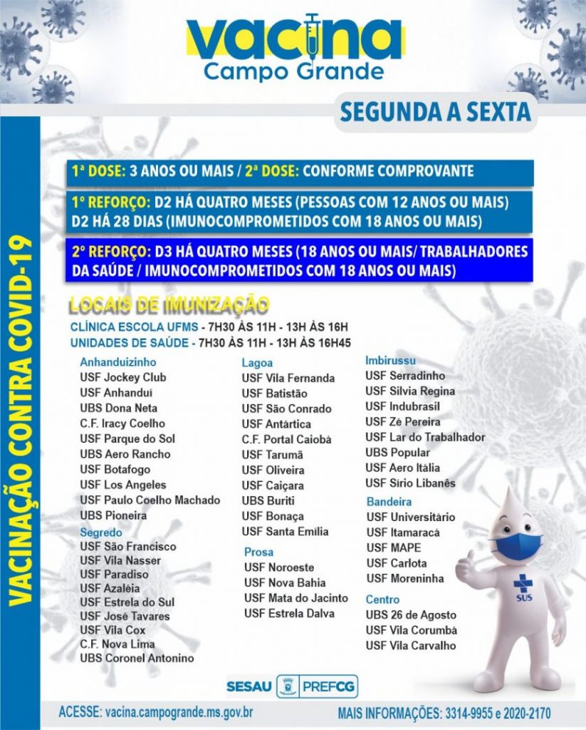 Nesta segunda-feira (28), mais de 40 locais em Campo Grande aplicam as doses do imunizante. O atendimento é das 7h30 às 16h45 (confira o cronograma no final desta matéria).