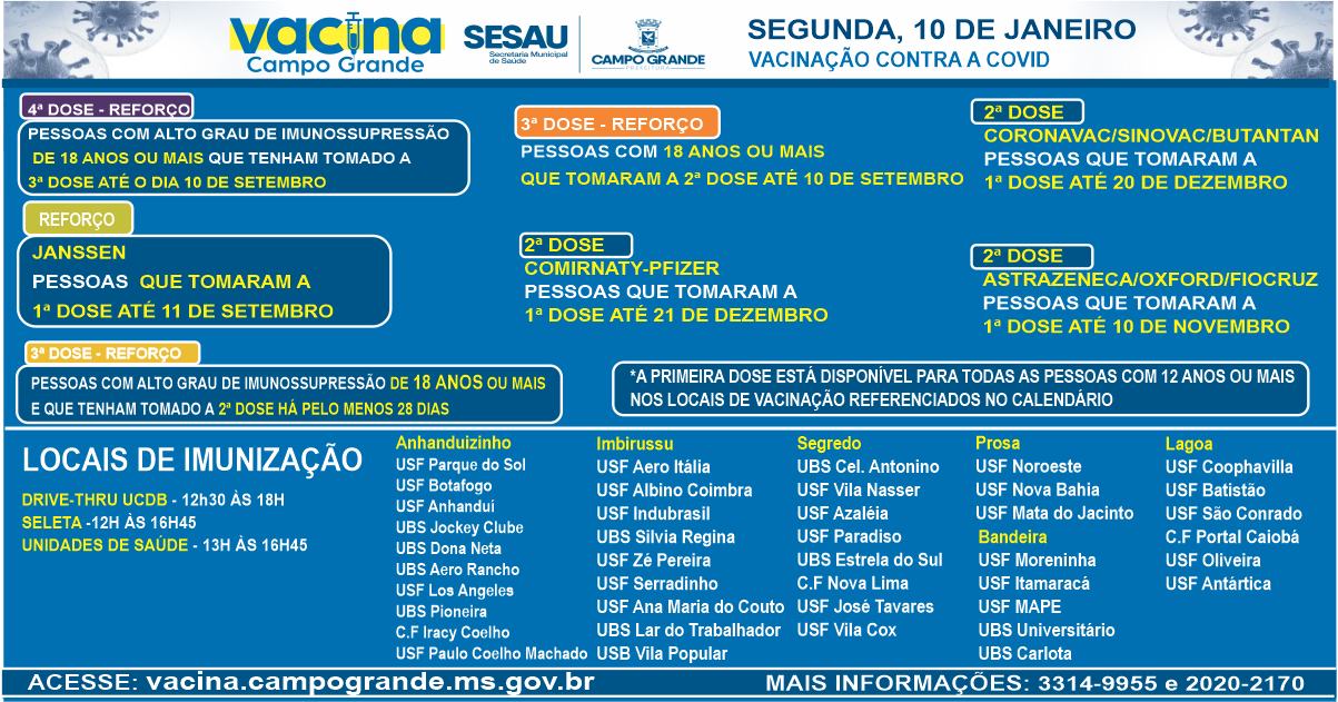 A vacinação contra a Covid-19 segue a todo vapor nesta segunda-feira (10), em Campo Grande. Conforme a Sesau (Secretaria Municipal de Saúde), hoje, serão aplicadas as doses de reforço das vacinas Coronavac, Astrazeneca, Janssen e Pfizer a partir das 12h.