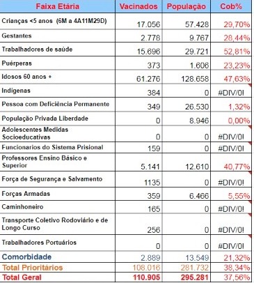 Dentre os grupos, o maior índice de vacinação está entre trabalhadores de saúde, com 52,81% de imunização, até esta manhã. Na sequência, vêm professores de ensino básico e superior, com 40,77%. Os menores índices estão entre pessoas com deficiência permanente (1,32%) e forças armadas (5,55%). A pasta alerta, no entanto, que os índices podem mudar até o fim desta sexta-feira.