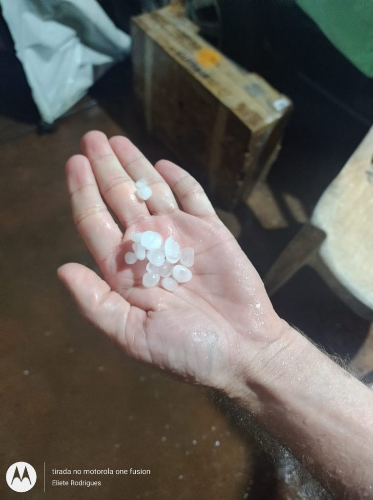 Leitora enviou foto de trecho na Avenida Gunter Hans, região do Bairro Guanandi. “Rua da Enseada, Coophavila II, fiação está toda no chão”, comentou a leitora Yara Guedes que enviou foto de uma árvore caída ao solo. Local está sem energia elétrica. Já a leitora Eliete Rodrigues enviou foto com granizo na mão.